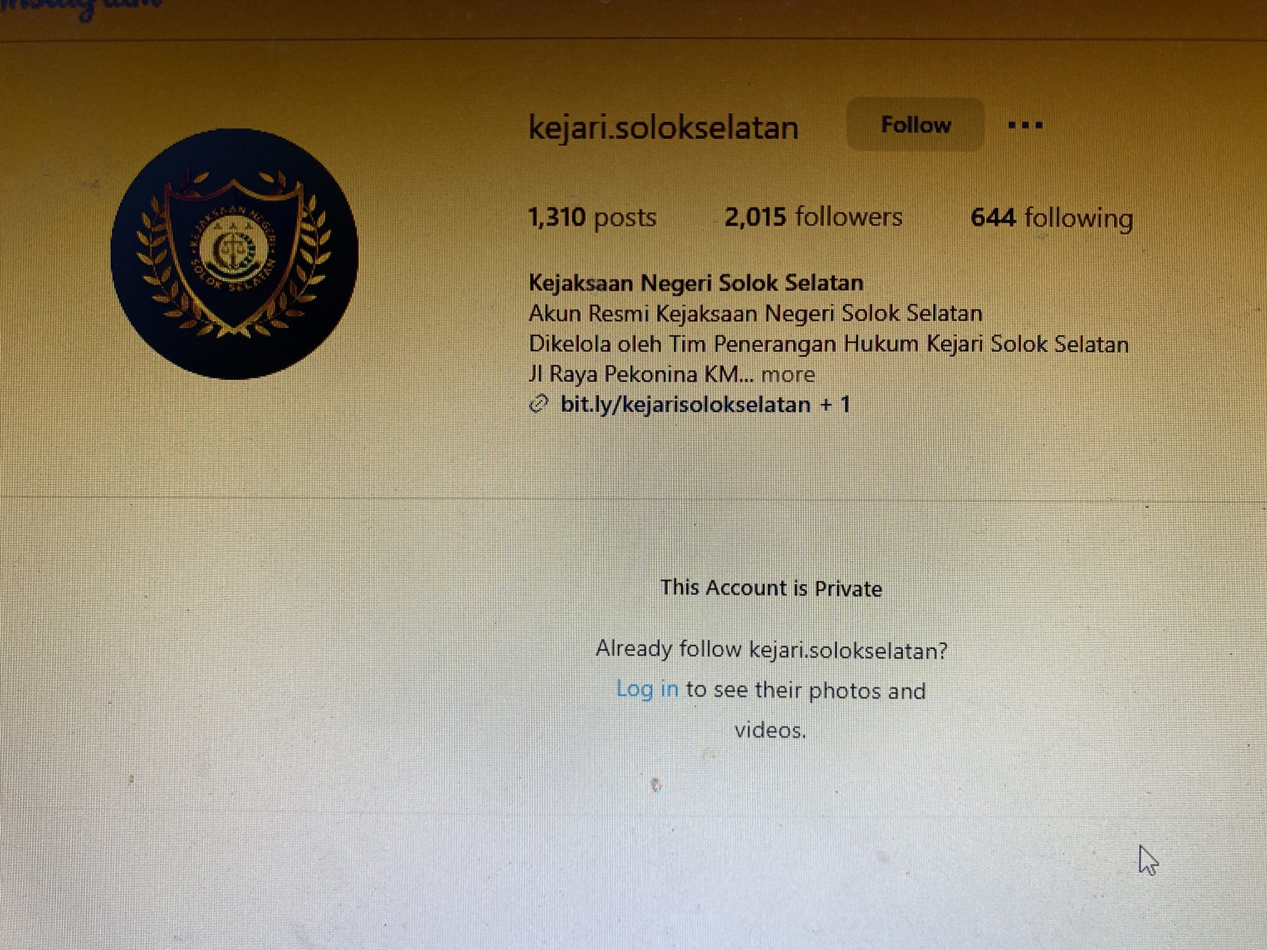 Berdasarkan pantauan langsung tim investigasi, pada Selasa, 26 Agustus 2025 pukul 12.02 WIB, akun media sosial resmi Kejaksaan Negeri Solok Selatan tercatat dalam kondisi diprivat sehingga tidak dapat diakses publik.